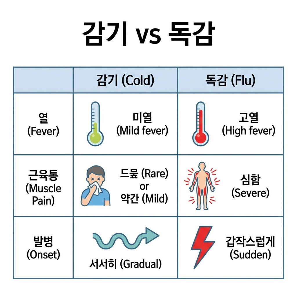 증상이 비슷해서 헷갈리기 쉽지만, 독감은 '갑작스러운 고열'과 '전신 근육통'이 특징입니다.