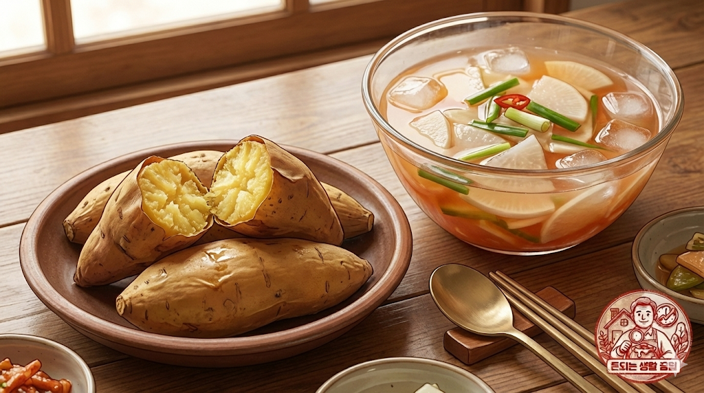 역시 옛 어른들 말씀 틀린 게 없습니다. 동치미나 사과 속의 '펙틴'과 '디아스타아제'가 고구마의 소화를 돕고, 가스가 차는 것(방귀)을 막아줍니다.