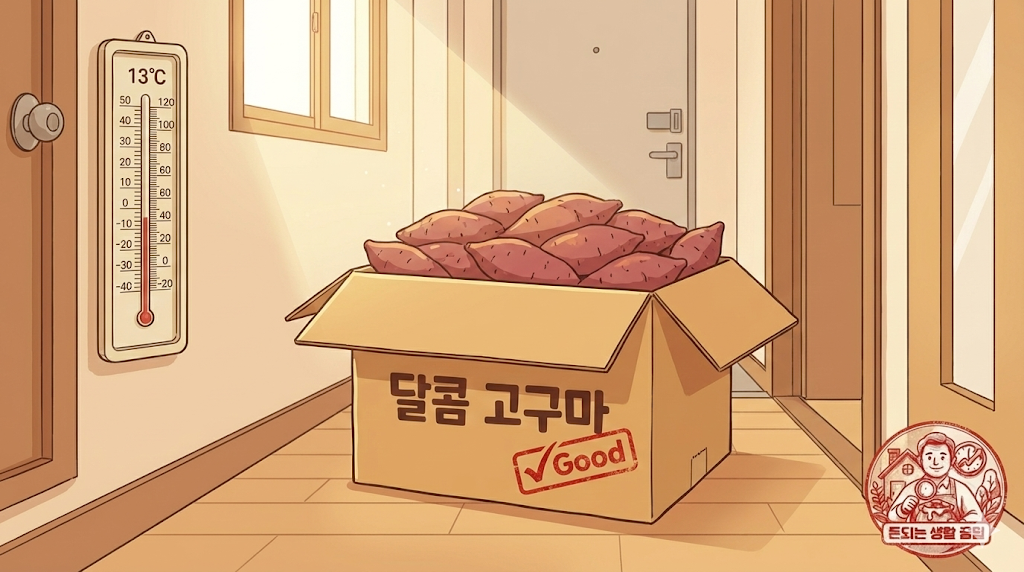 현관/실내 보관: 고구마가 가장 좋아하는 온도는 12~15도입니다. 추운 베란다보다는 현관 입구나 부엌 구석이 명당입니다.