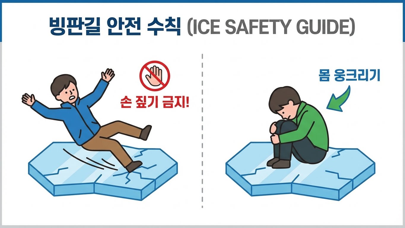 물론 찰나의 순간에 쉽지 않겠지만, "손 짚지 말고 구르자"라고 계속 되뇌어 주세요. 주머니에 손을 넣고 걷는 건 절대 금물입니다! (장갑 필수!)